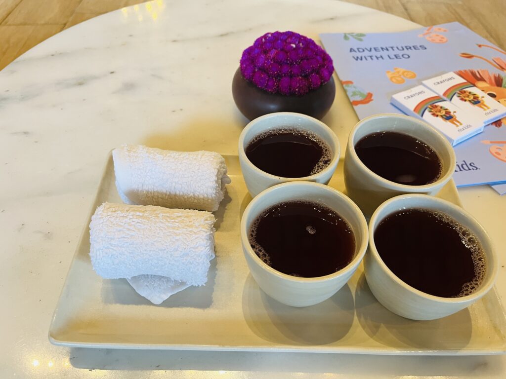 チェックインの際、テーブルに運ばれてきたのがこのウェルカムトレイ。家族4人分のコーヒー、冷たいおしぼり、そして…なんと子ども用の「Ritz Kids」ウェルカムキットまで!