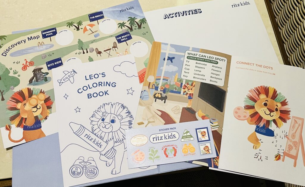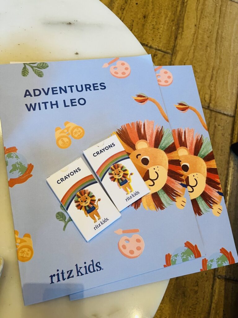 リッツキッズのマスコットキャラクター「レオ(ライオン)」がデザインされたカラフルな冊子と、リッツキッズオリジナルのクレヨンが子ども2人分。子どもたちが真っ先に飛びついて、早速使い始めていました(笑)