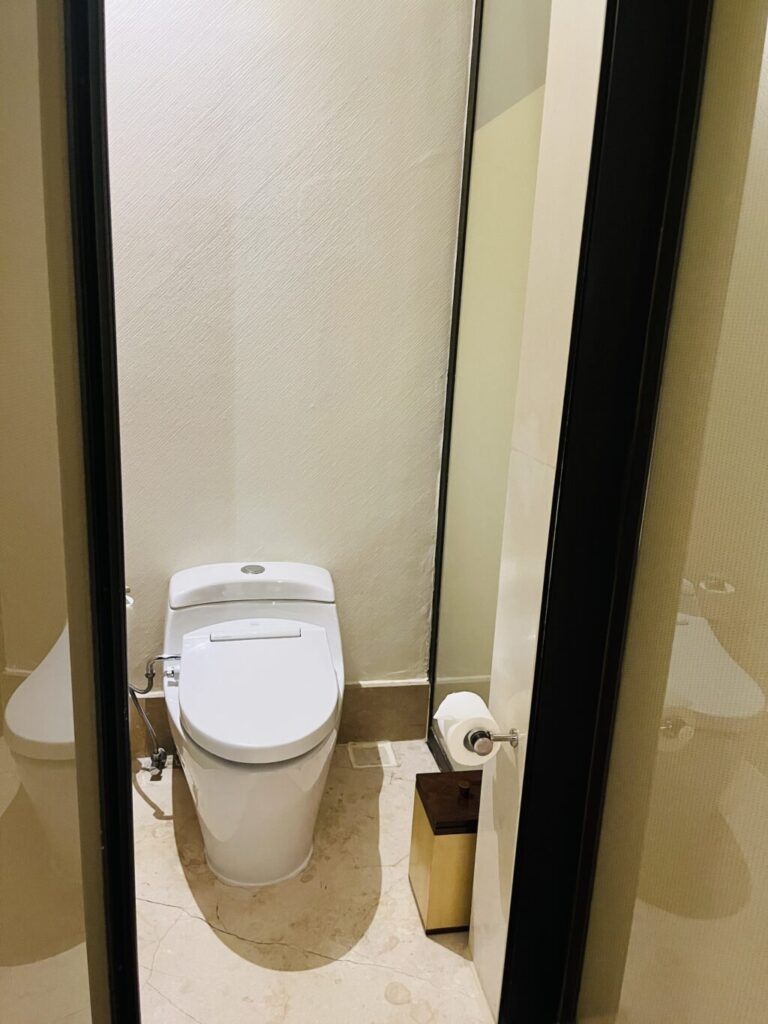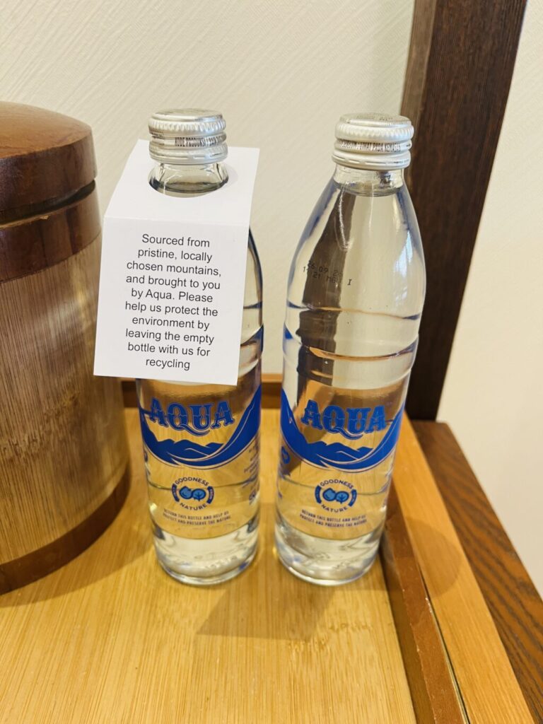 お部屋に置いてあるミネラルウォーターは、インドネシアのブランドAQUAのガラスボトル。プラスチックではなくガラスボトルというのが環境への配慮を感じます。「空き瓶はリサイクルのためにそのままにしてください」というメッセージカードが付いていて、こういうところもリッツらしいな、と思いました。