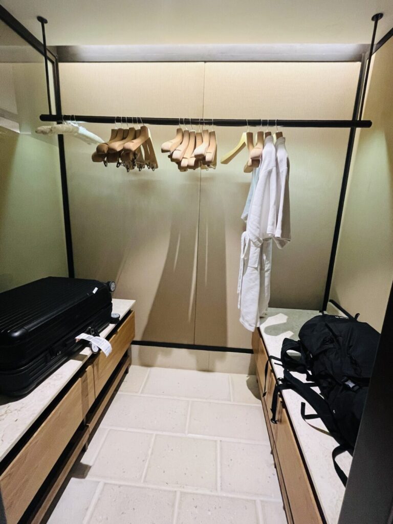 クローゼットはウォークインタイプで広々。両側にスーツケースが置ける台があり、荷物を出しっぱなしにしてもスッキリ使えます。木製のハンガーがたっぷり用意されており、バスローブも人数分ちゃんとありました。