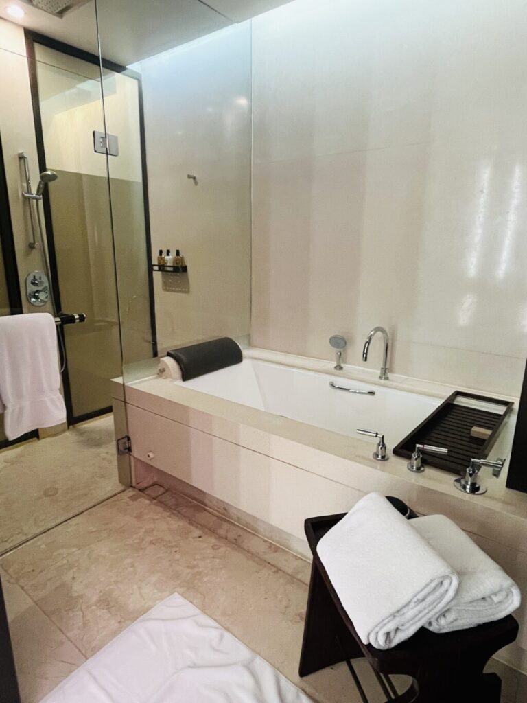 バスタブはゆったりサイズ。子どもと一緒にのびのび入れる大きさです。隣にはガラス張りのシャワーブースが独立してあり、大人はシャワーを、子どもはバスタブをと使い分けられてとても便利でした。