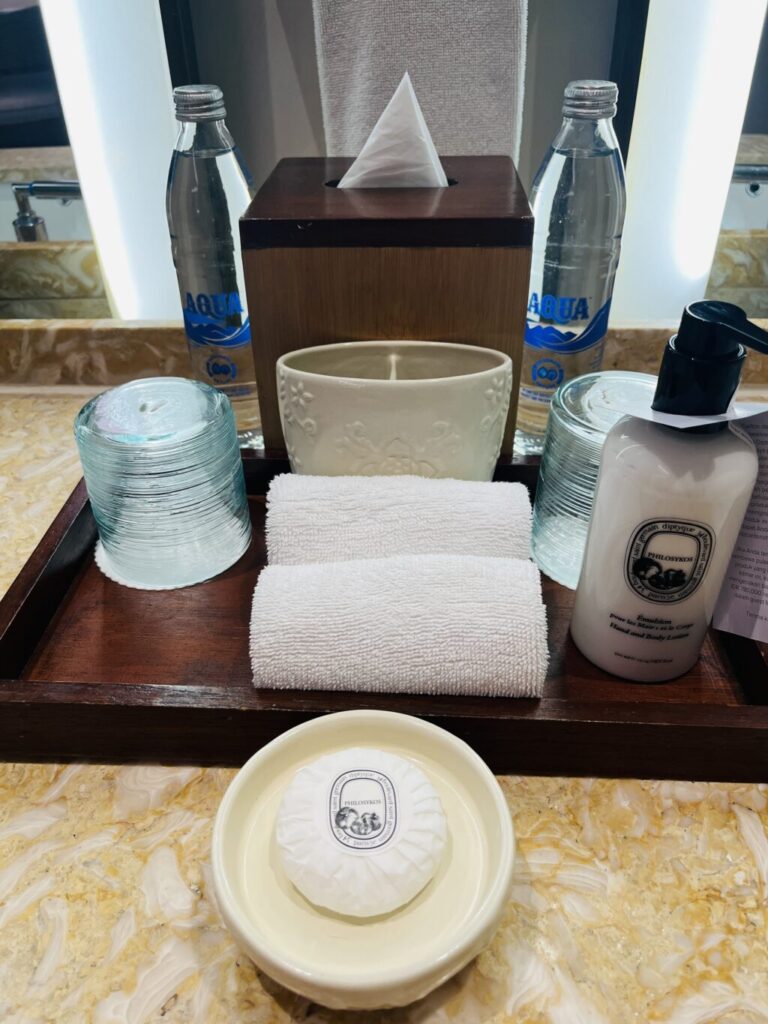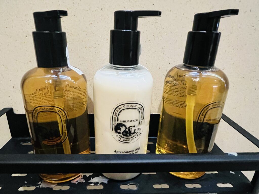 アメニティはDiptyque(ディプティック)!パリ発の高級フレグランスブランドで、「Philosykos(フィロシコス)」というイチジクの香りのライン。シャンプーからボディローション、石鹸まで全部ディプティックで揃えられていて、毎日のバスタイムがとても贅沢な気分でした。