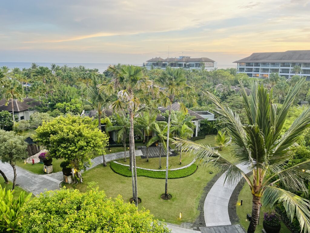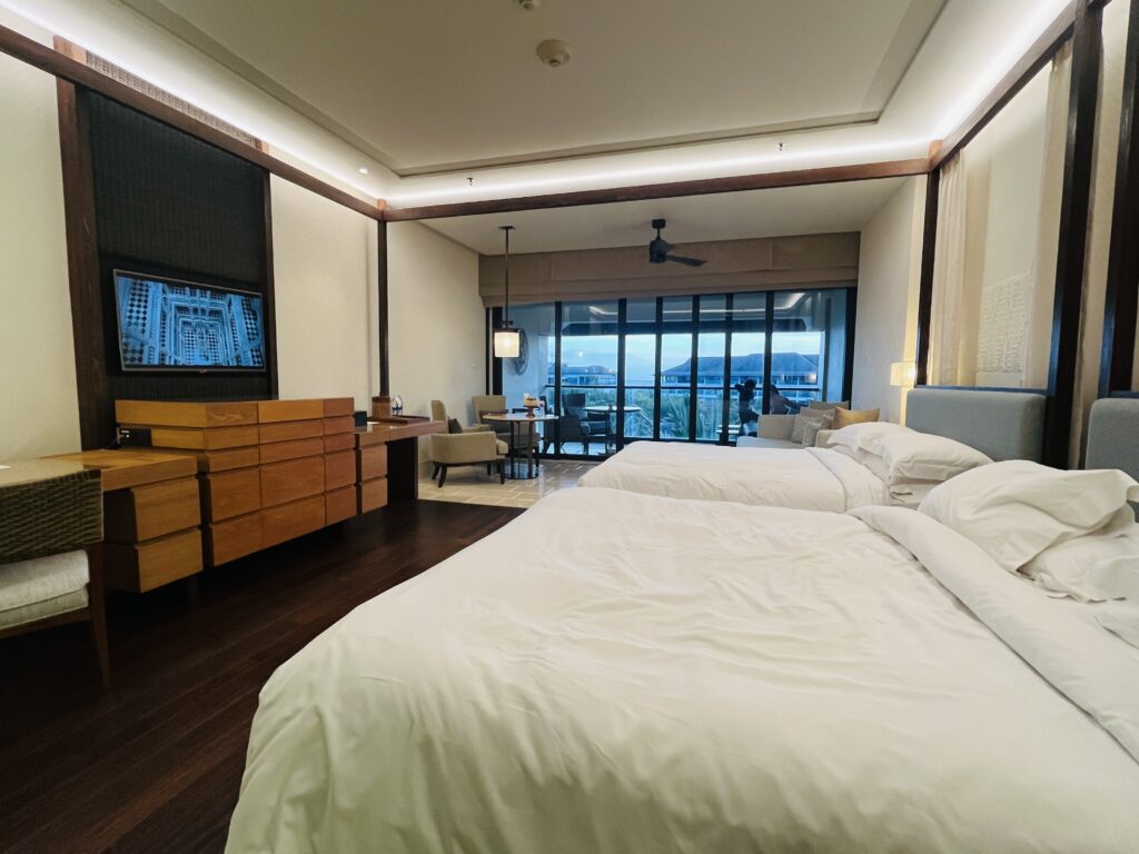 ベッドが2台あり、親子4人でゆったり就寝できました。大きな窓からはホテルのリゾートエリアと海が広がる眺め。夕暮れ時は特に美しくて、しばらく眺めていました。