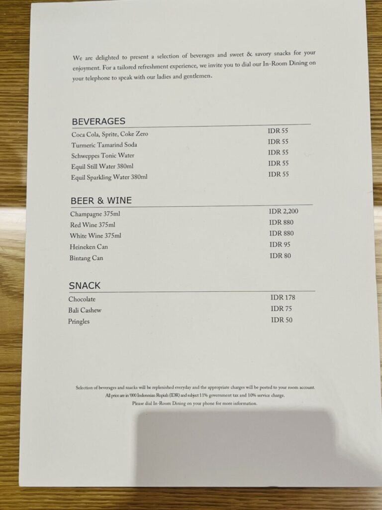 ミニバーのメニューも参考に。ソフトドリンクは約IDR 55,000(約550円)、ビールはビンタン缶がIDR 80,000(約800円)、ハイネケン缶がIDR 95,000(約950円)。チャンパンもありました!スナックはバリカシューナッツ(IDR 75,000)やプリングルス(IDR 50,000)なども。
