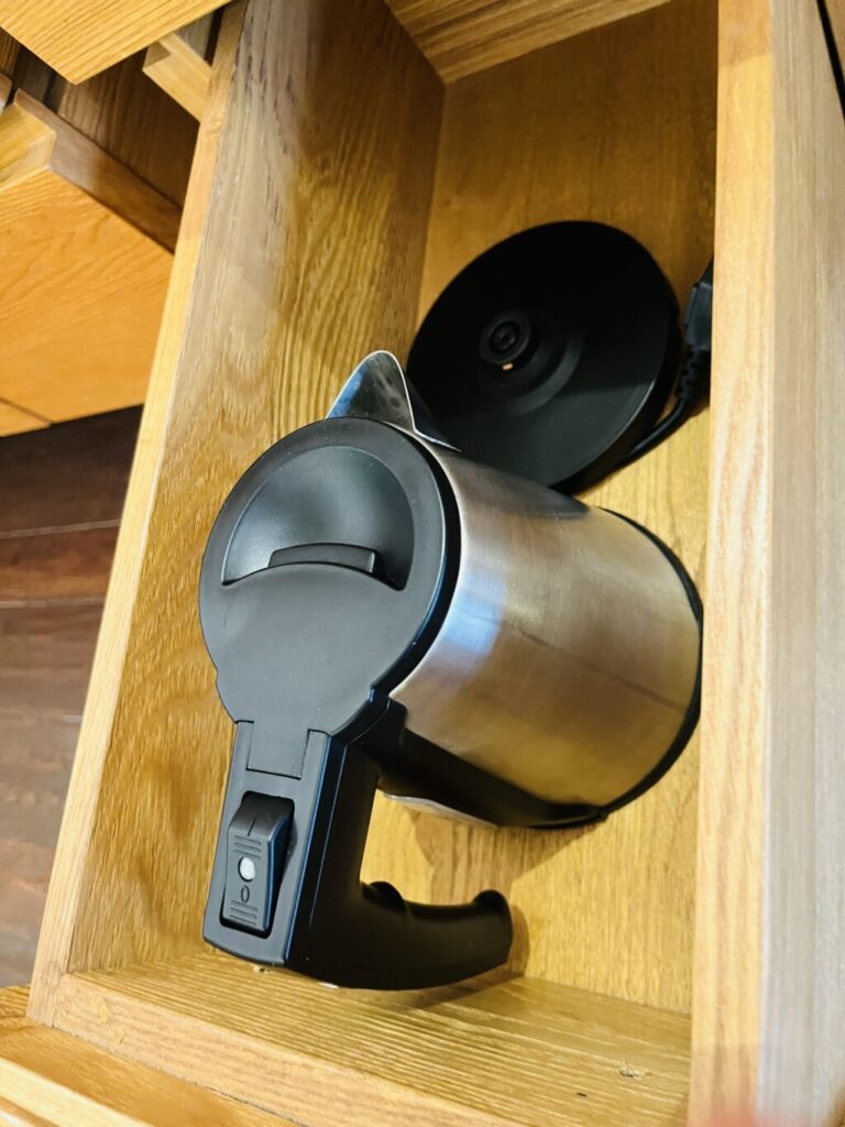 電気ケトルは引き出しの中にすっきり収納されていました。子どもの粉末ジュースを溶かしたり、カップ麺を作ったりと、子連れ旅行では地味に大活躍しました。