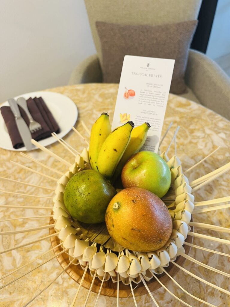テーブルの上には南国フルーツのウェルカムギフトが。バナナ・マンゴー・ライムなどが竹細工のかごに盛られていて、見た目もおしゃれです。