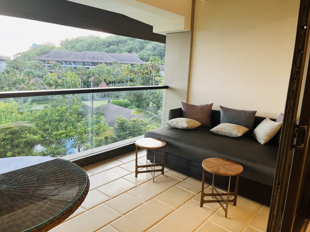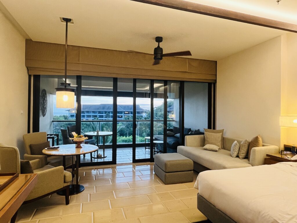 ベッドルームと繋がったリビングスペース。大きなソファと、大理石のラウンドテーブルが2脚。天井のシーリングファンがゆっくり回っていて、南国らしい雰囲気たっぷりです。大きなスライディングドアの向こうにはバルコニーと、ヤシの木に囲まれた緑豊かなリゾートの景色が広がっています。