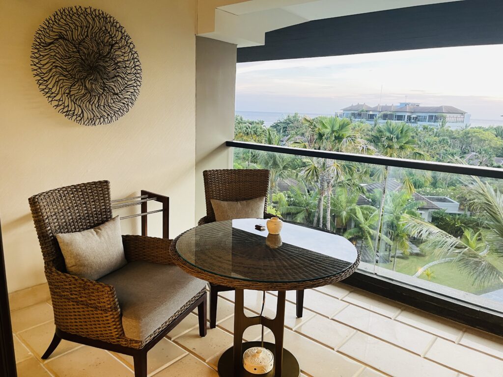 バルコニーにはラタン素材のチェアとテーブル、そして横になれるデイベッドまで!朝の景色が本当に最高で、早起きしてここでコーヒーを飲む時間が毎日の楽しみになりました。緑の庭園の先に海がキラキラと輝いて見えて、「ああ、バリに来てよかった〜」としみじみ感じた瞬間です。