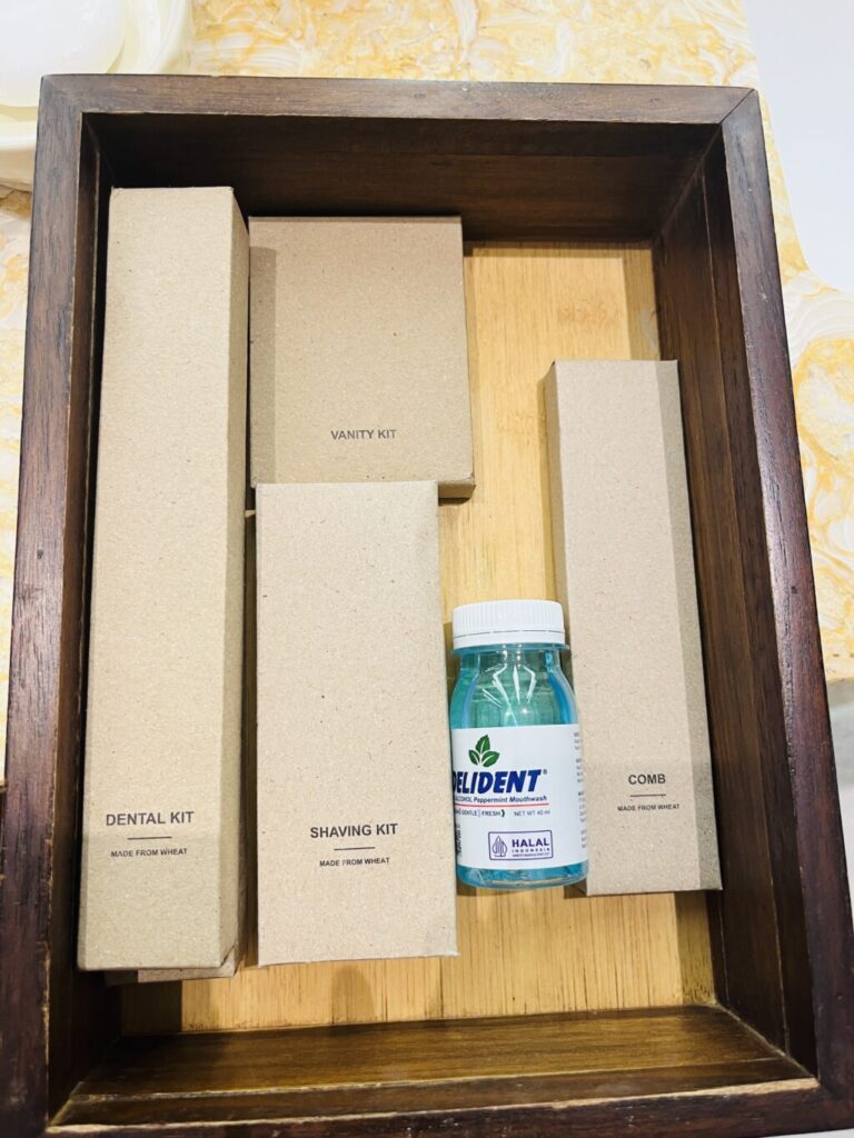洗面台の引き出しに入っていたアメニティ類がユニークでした。歯ブラシ(Dental Kit)、シェービングキット、コーム、バニティキット…全部クラフト紙のパッケージで「Made from Wheat(小麦由来)」の表記が!プラスチックを極力使わないサステナブルな取り組みが感じられます。