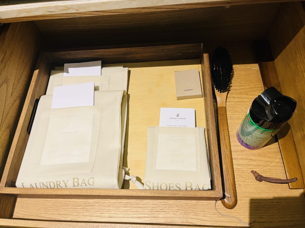 別の引き出しにはランドリーバッグ、シューズバッグ、ソーイングキット、靴磨きブラシまで。リッツカールトンバリでは「夕方の靴磨きサービス」もあるようで、夜の間に靴をピカピカにしてくれるサービスカードも入っていました。