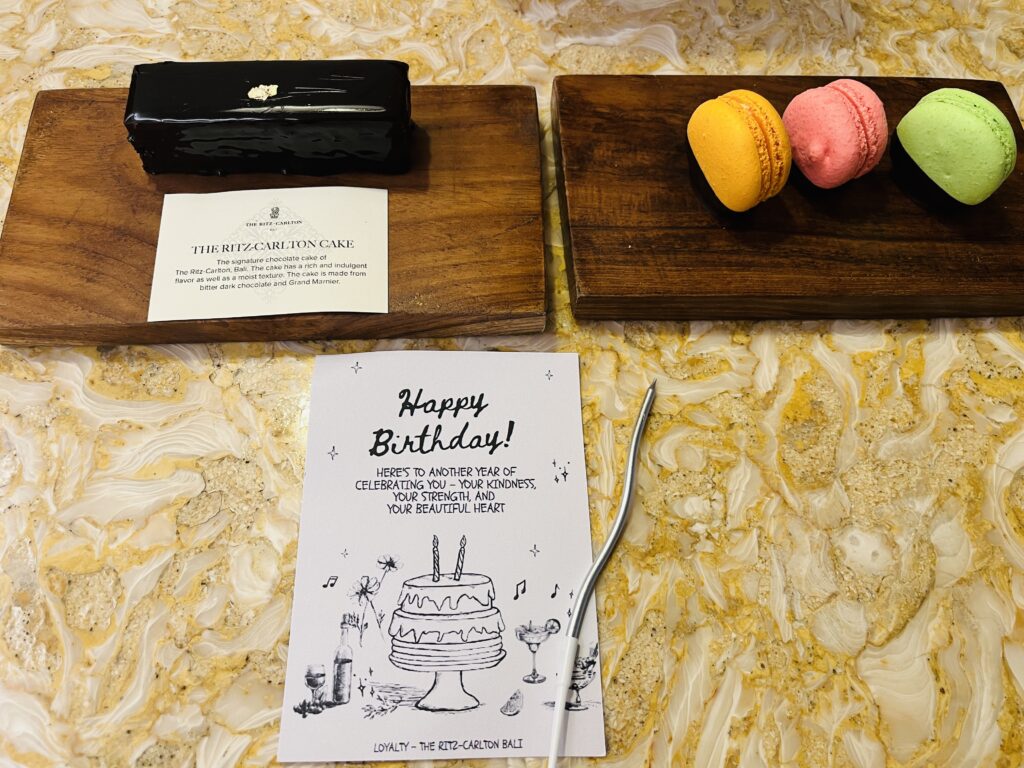 部屋に戻ると、テーブルの上にリッツカールトンのシグネチャーチョコレートケーキとカラフルなマカロン、そして手書き風の「Happy Birthday!」カードが置いてあったんです。