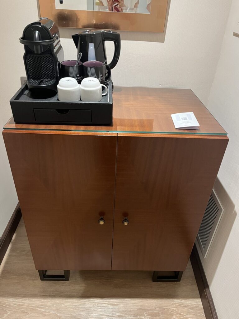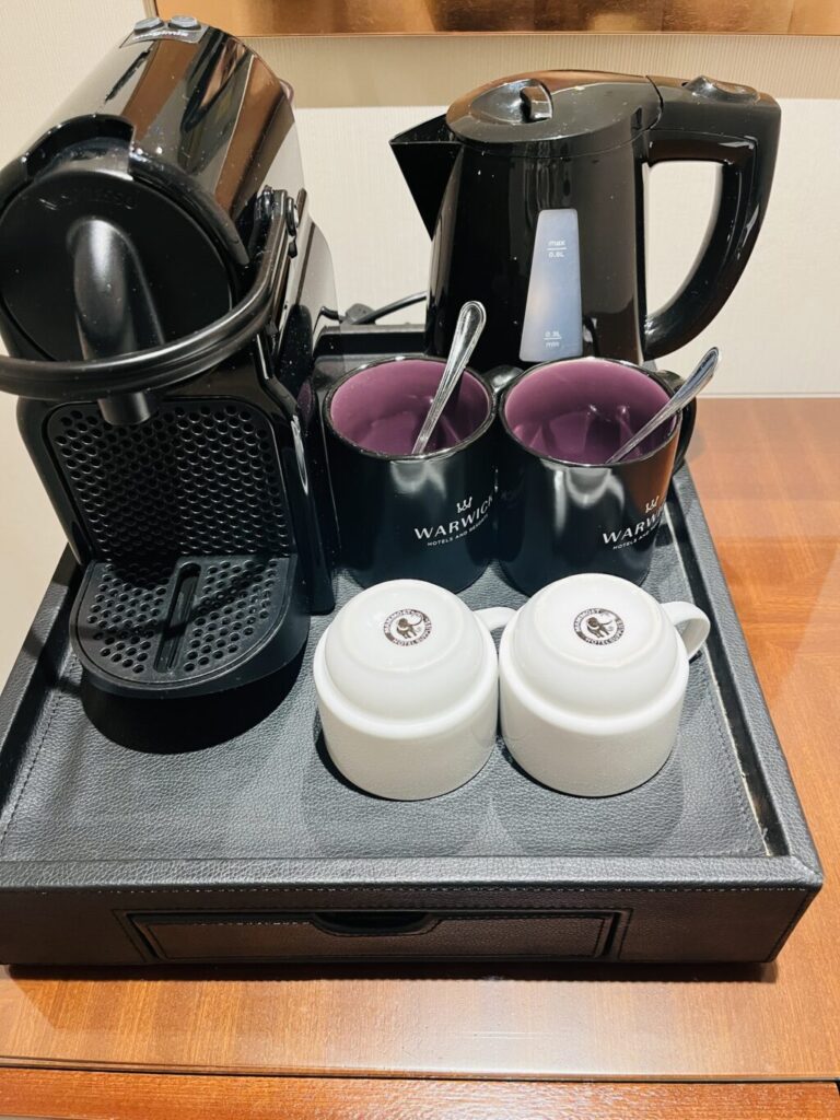 ネスプレッソコーヒーメーカー、湯沸かしポット、マグカップ類。一通り揃っています。
