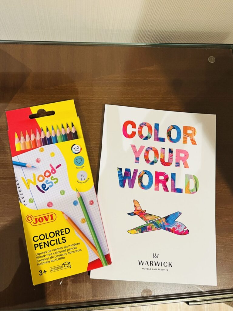 チェックインの際には、息子に色鉛筆と塗り絵のセットをプレゼントしてくれました。長旅で疲れていた息子も、これには大喜び!