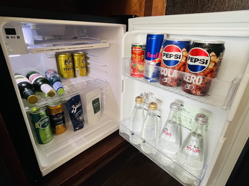 冷蔵庫には水、ソフトドリンク、アルコール類が揃っています。(有料)