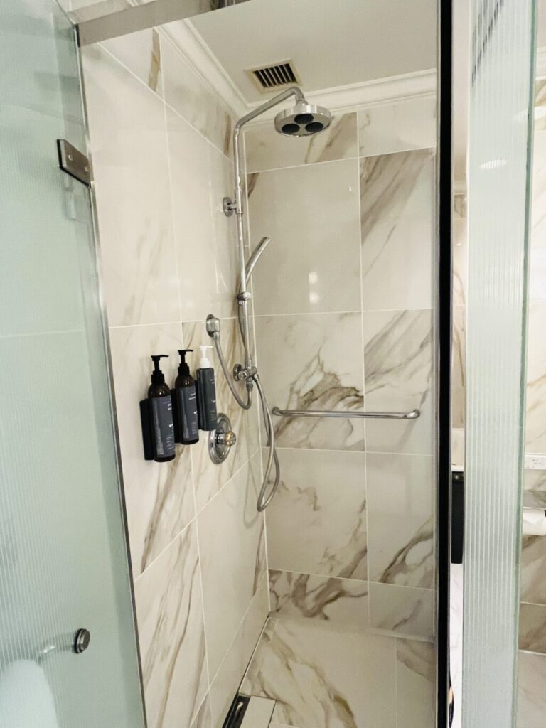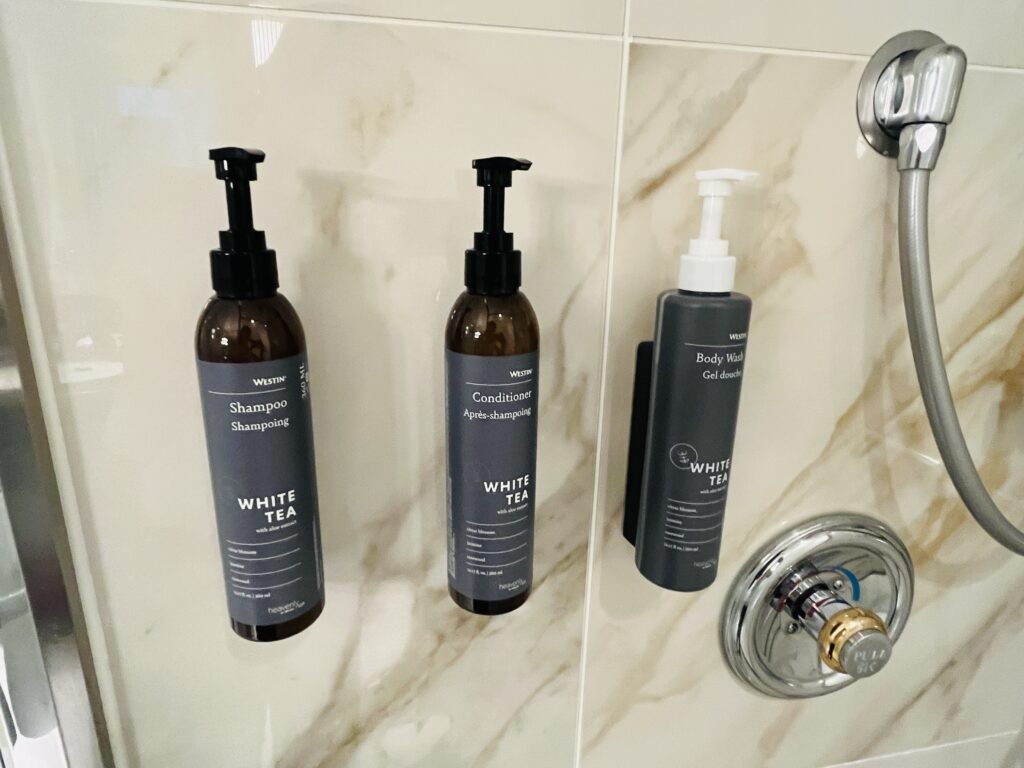 シャワールームのアメニティ(シャンプー、コンディショナー、ボディウォッシュ)はウェスティンブランドWHITE TEA。