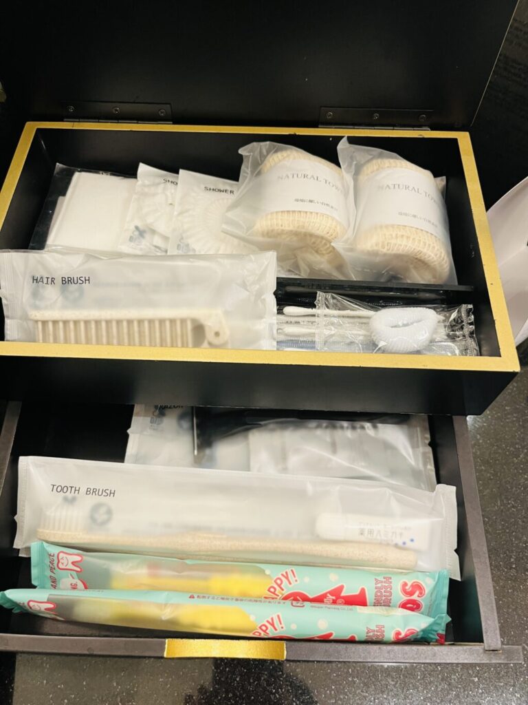 アメニティは歯ブラシ(大人、子ども用)、ボディタオル、シャワーキャップ、綿棒、ヘアゴム、コットン。
